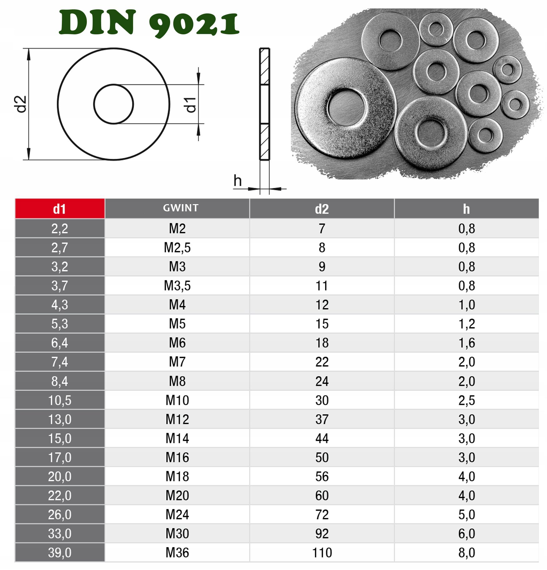 Podkładka powiększona oparta jest na rozwiązaniu, którego zadaniem jest zwiększenie powierzchni dociskowej. W efekcie ustalono, że średnica zewnętrzna podkładki powiększonej DIN 9021 jest w przybliżeniu trzykrotnie większa niż średnica otworu wewnętrznego, przez który przeprowadza się śrubę.